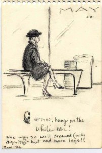 I was so glad I had a sketch book and a pencil with me that morning to get a sketchy note of what I was observing. That was 1984, and many years later and I finally got around to doing a nice 8 x 10 inch watercolor of her and I titled it “Stockings Needed.”